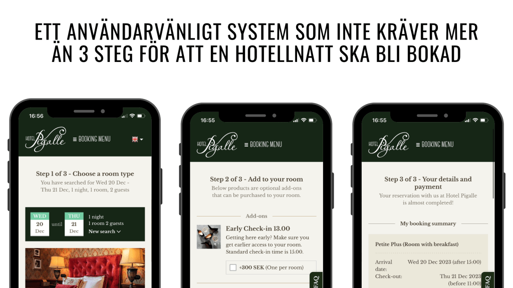 - Sömlös integration. Vi erbjuder en integrerad lösning som sträcker sig över alla dina kontaktpunkter. För att göra det så smidigt och användarvänligt som möjligt har vi samlat allt under ett tak – allt från webbplatsbokningar till hantering av gästrecensioner. 8 av 10 som bokar via till exempel booking.com går alltid in på hotellets hemsida först. En sömlös integration mellan din webbplats och bokningsmotor ger dina gäster möjlighet att boka utan att någonsin lämna hemsidan. Funktioner som en tydlig kalender, rumsval och säkra betalningar säkerställer att dina gäster känner sig trygga med att boka på din webbplats.