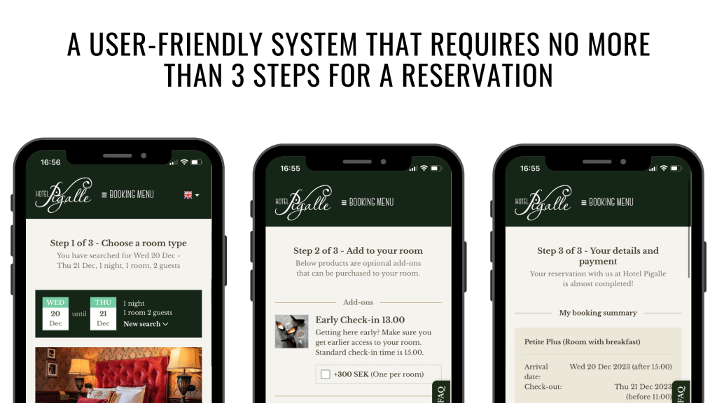 - Seamless integration. We offer an integrated solution that spans all your touchpoints. To make it as smooth and user-friendly as possible, we have gathered everything under one roof – from website bookings to managing guest reviews. 8 out of 10 people who book via booking.com, for example, always go to the hotel’s website first. A seamless integration between your website and booking engine allows your guests to book without ever leaving the website. Features like a distinct calendar, room selection and secure payments ensure that your guests feel comfortable booking on your website.